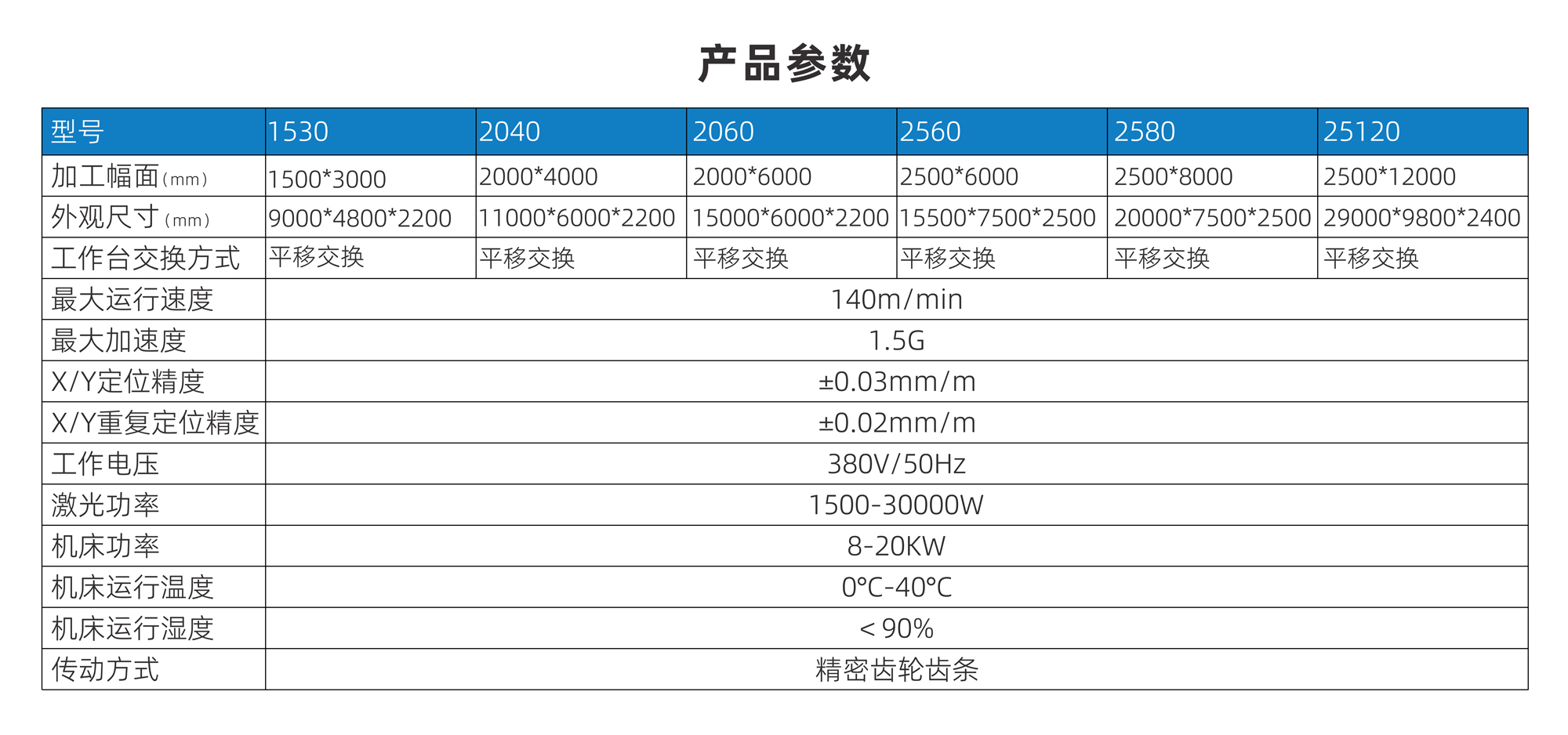 加工幅面(mm) | 1500*3000 | 2000*4000 | 2000*6000 | 2500*6000 | 2500*8000 | 2500*12000 |